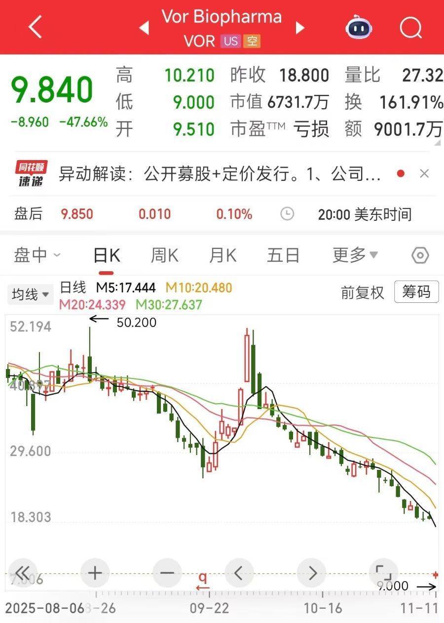 这一暴跌的直接导火索是Vor Bio公司前一天收盘发布的增发与出售股份公告,其同意通过私募方式向投资者发行并出售PIPE认股权证,以每份PIPE认股权证5.00美元的价格购买至多34,999,999股普通股,募集资金总额为1.75亿美元。